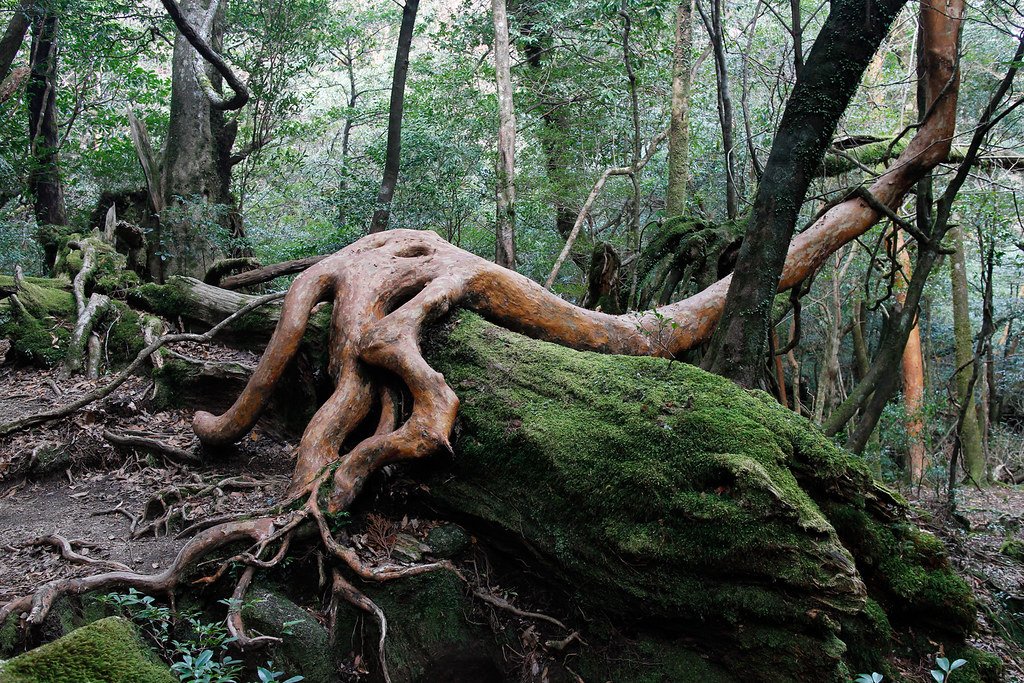 愛子は古い屋久杉のそばの平らな石に座った。 木は巨大で、ねじれた幹、むき出しの根が大地を優しく抱きしめている。 彼女は背中を幹に預け、目を閉じた。